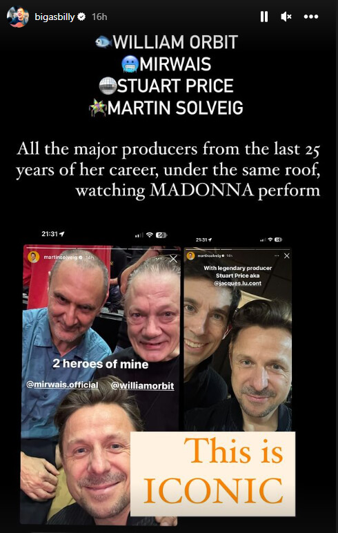 William Orbit, Mirwais, Stuart Price and Martin Solveig all attended the Monday night (November 13) tour stop at Paris Accor Arena in France, and were photographed hanging out and/or taking selfies through the show.